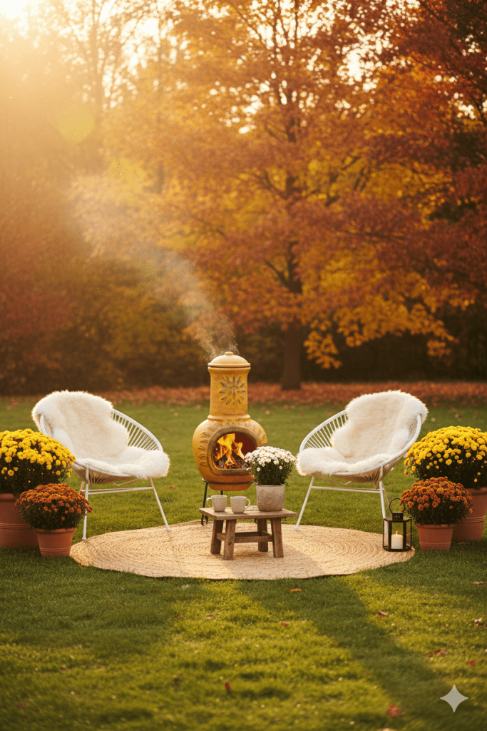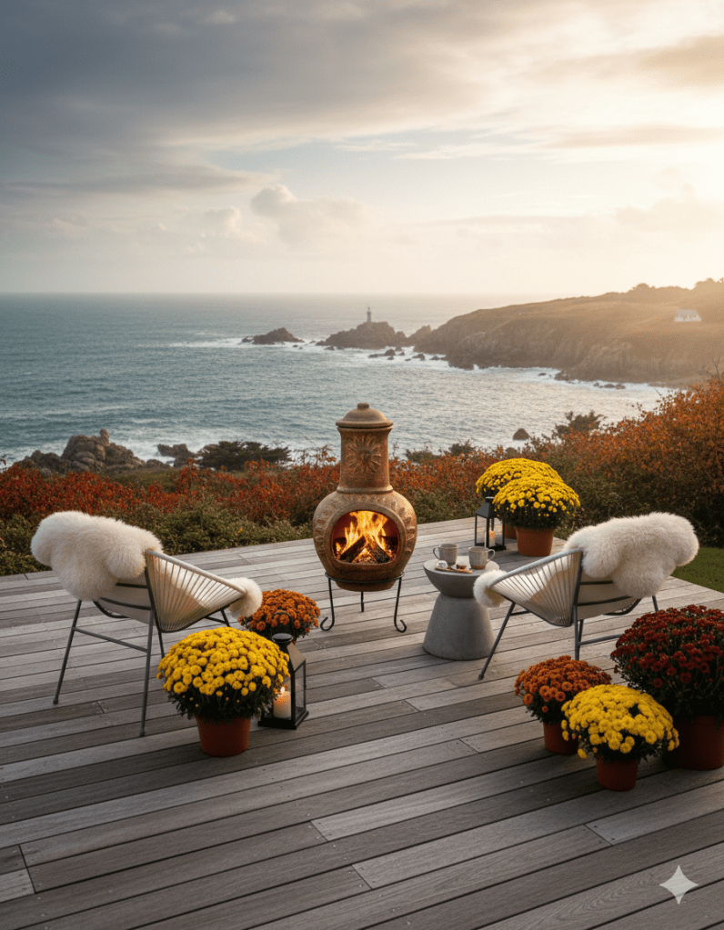 đȘ» Des pots fleuris avec des chrysanthĂšmes, des asters ou des dahlias aux pieds du brasero.